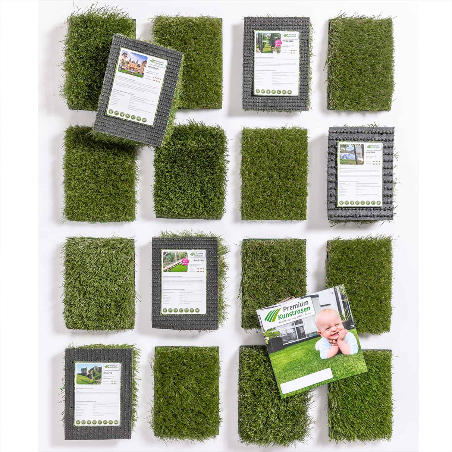 Überzeugen Sie sich von der Authentizität unserer Premium-Kunstrasen-Modelle und fordern Sie hier Ihre kostenlose Musterbox an. Mit unserer Musterbox erhalten Sie kleine 15 x 20 cm große Muster all unserer Kunstrasenmodelle.